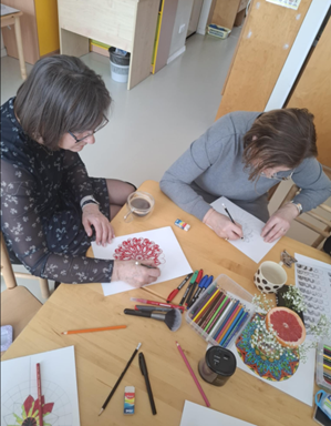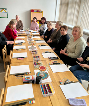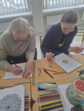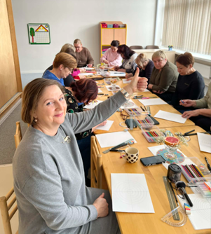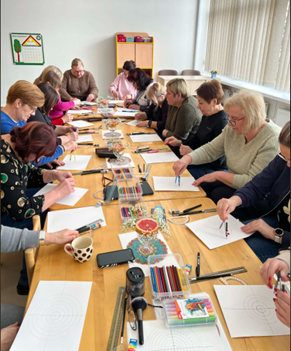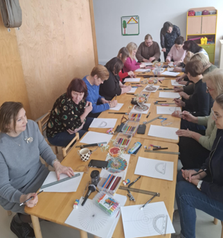 Užsiėmimą vedė Šiaulių Ragainės progimnazijos socialinė pedagogė Jolanta Rimienė, turinti patirties kūrybinėse praktikose bei suaugusiųjų emocinio ugdymo srityje. Užsiėmimo metu vyko ne tik piešimas, bet ir gilesnis pažinimas per spalvas, linijas, kurios kvietė pažvelgti į savo vidinę būseną iš naujo kampo.