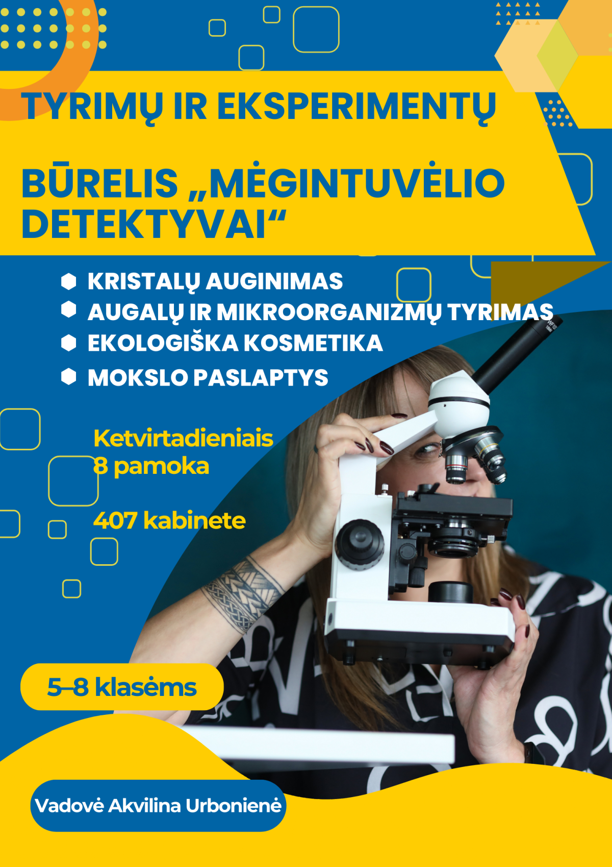 - Tyrimų ir eksperimentų būrelis „Mėgintuvėlio detektyvas“ (5-8 kl.), Akvilina Urbonienė;